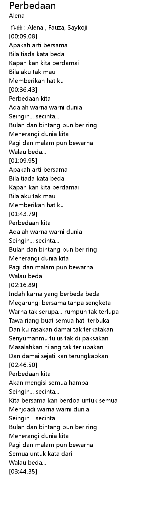 | [01:44.43] | Perbedaan kita |
