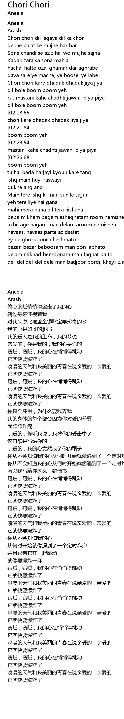 | [02:27.97][02:18.55][02:08.97][01:59.19][01:18.05][01:08.37][00:36.82] | chori chori kare dhadak dhadak jiya jiya |