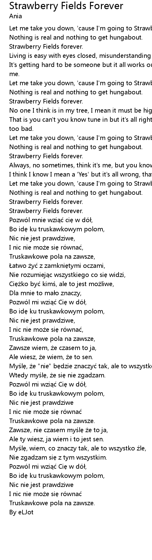| Let me take you down, ' cause I' m going to Strawberry Fields. | |
