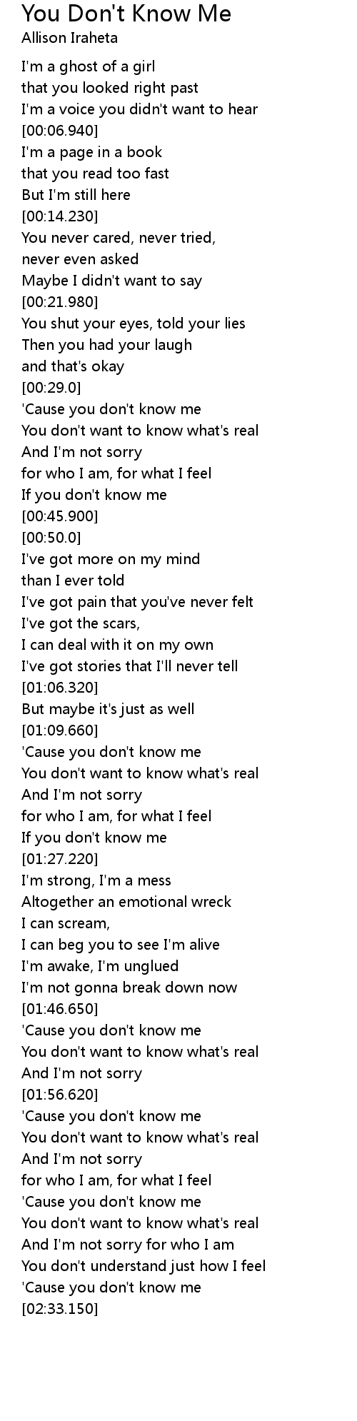| [00:29.250] | ' Cause you don' t know me |