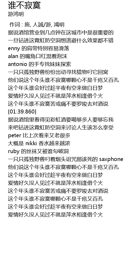 | [02:59.820] | 这个年头谁不寂寞苦或痛不要罗唆去对酒说 |