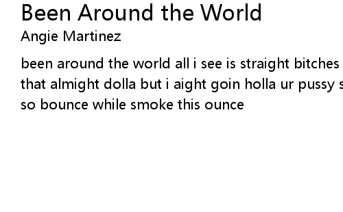| been around the world all i see is straight bitches snitchin do anything for that almight dolla but i aight goin holla ur pussy smell worse thin a fish tank so bounce while smoke this ounce |
