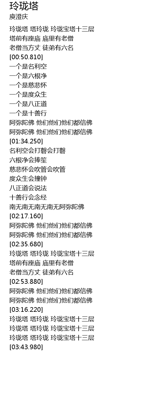 | [03:33.970] | 玲珑塔 塔玲珑 玲珑宝塔十三层 |