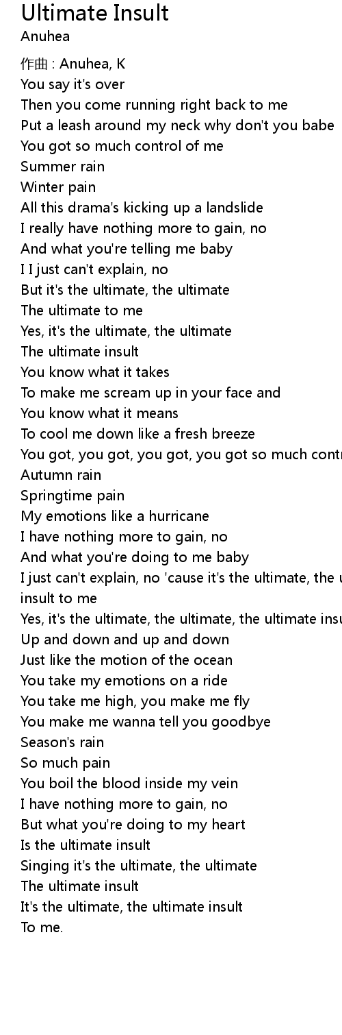 | I just can' t explain, no ' cause it' s the ultimate, the ultimate, the ultimate insult to me | |