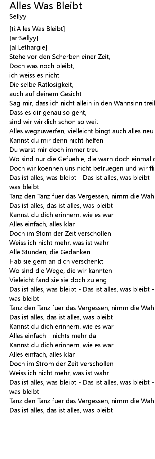 | [01:51.79] | Das ist alles, was bleibt - Das ist alles, was bleibt - Das ist alles, was bleibt |