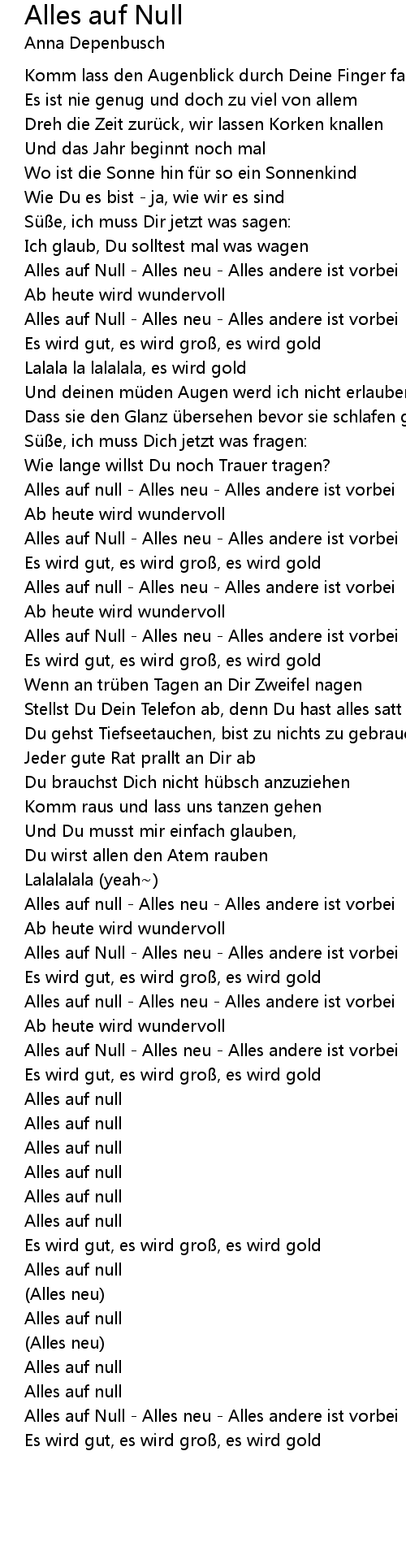 | [00:37.23] | Alles auf Null Alles neu Alles andere ist vorbei |
