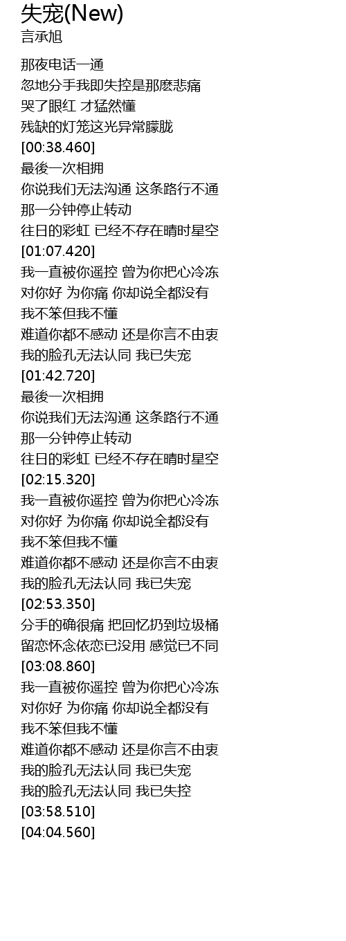 | [03:46.500] | wǒ de liǎn kǒng wú fǎ rèn tóng wǒ yǐ shī kòng |