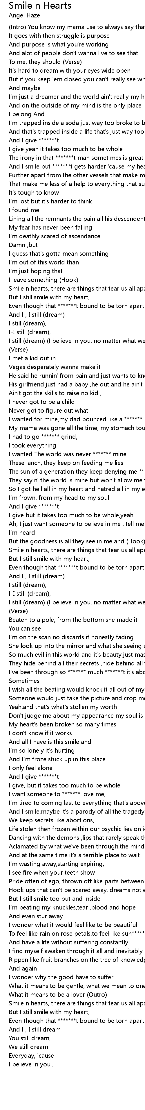 And I smile but *******t gets harder 'cause my heart is growing |