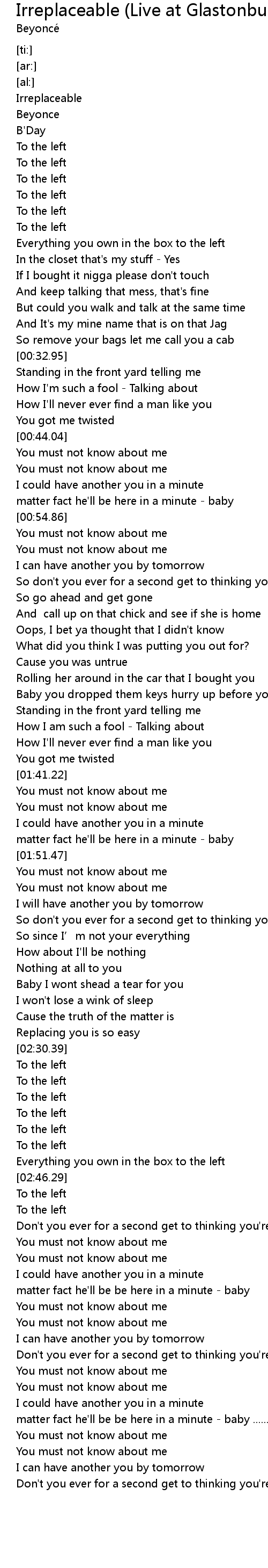 | [01:59.46] | So don't you ever for a second get to thinking you're irreplaceable |