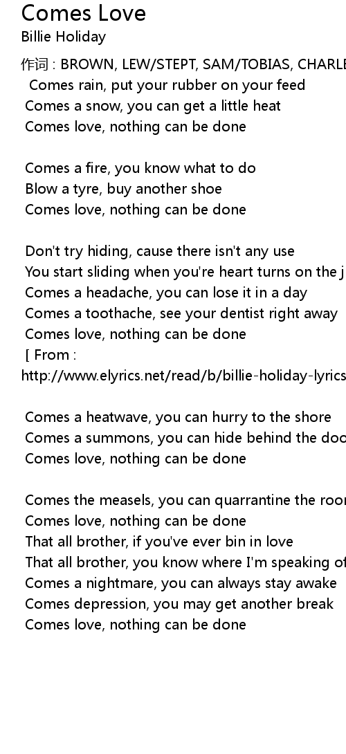 | [ From : http://www.elyrics.net/read/b/billie-holiday-lyrics/comes-love-lyrics.html ] | |