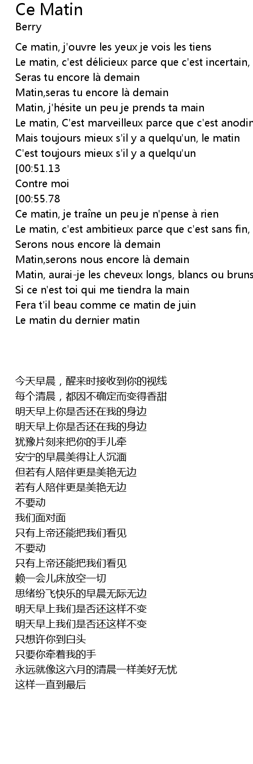 | [00:01.01] | Ce matin, j'ouvre les yeux je vois les tiens |
