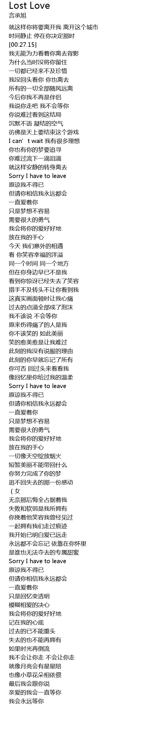 | [00:21.87] | 就这样你将要离开我 离开这个城市 |