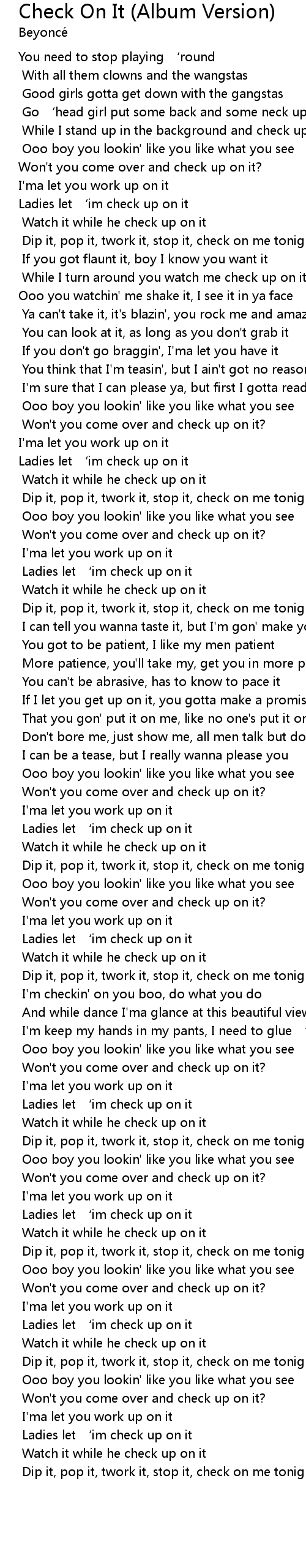 | [01:47.10] | Dip it, pop it, twork it, stop it, check on me tonight |