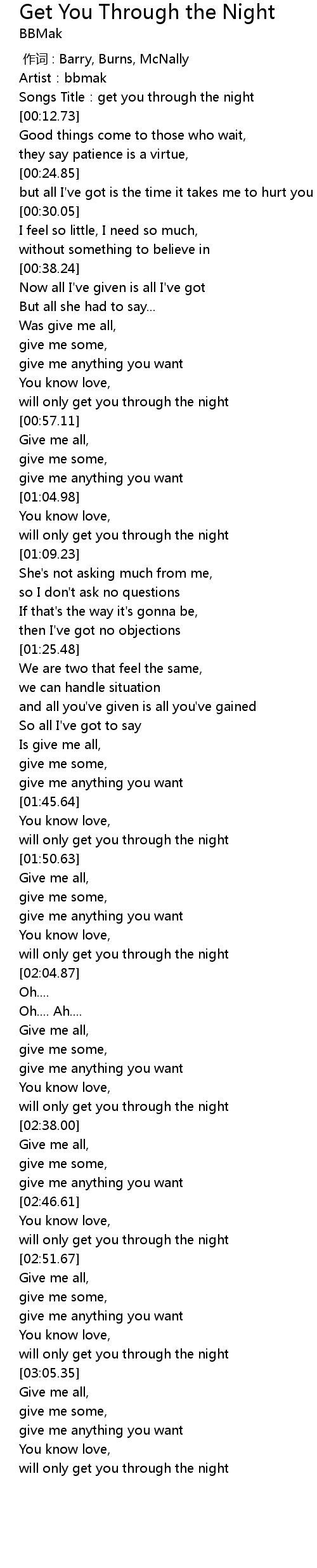 | [00:04.00] | Songs Title: get you through the night |