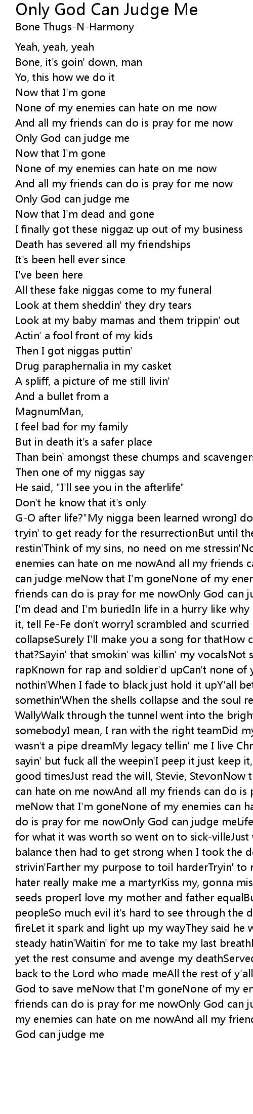 G-O after life?"My nigga been learned wrongI don't plan on goin' to heavenI'm tryin' to get ready for the resurrectionBut until then I'm patiently restin'Think of my sins, no need on me stressin'Now that I'm goneNone of my enemies can hate on me nowAnd all my friends can do is pray for me nowOnly God can judge meNow that I'm goneNone of my enemies can hate on me nowAnd all my friends can do is pray for me nowOnly God can judge meSee, now that I'm gone and I'm dead and I'm buriedIn life in a hurry like why did I run with straps?I made it, tell Fe-Fe don't worryI scrambled and scurried but only my lungs collapseSurely I'll make you a song for thatHow could I really go wrong with that?Sayin' that smokin' was killin' my vocalsNot sayin' that Layzie put on for rapKnown for rap and soldier'd upCan't none of y'all say that I owed y'all nothin'When I fade to black just hold it upY'all better say that I made y'all somethin'When the shells collapse and the soul relaxLookin' down at yo' body, WallyWalk through the tunnel went into the bright lightHopin' he did right by somebodyI mean, I ran with the right teamDid my dirt had fun in the night lifeIt wasn't a pipe dreamMy legacy tellin' me I live Christ-likeI hear what they sayin' but fuck all the weepin'I peep it just keep it, I live mineCelebrate them good timesJust read the will, Stevie, StevonNow that I'm goneNone of my enemies can hate on me nowAnd all my friends can do is pray for me nowOnly God can judge meNow that I'm goneNone of my enemies can hate on me nowAnd all my friends can do is pray for me nowOnly God can judge meLife dealt me a raw dealHad to make it for what it was worth so went on to sick-villeJust what have I done?Signed in my balance then had to get strong when I took the dealStrugglin' and strivin'Farther my purpose to toil harderTryin' to make good off my honor'Til a hater really make me a martyrKiss my, gonna miss my daughtersHope I taught my seeds properI love my mother and father equalBut I did damage to so many peopleSo much evil it's hard to see through the darkGotta fight fire with fireLet it spark and light up my wayThey said he went out in a blazeMy enemies steady hatin'Waitin' for me to take my last breathNo longer fleshHad peace and yet the rest consume and avenge my deathServed my stretch, did my bestThen it's back to the Lord who made meAll the rest of y'all can judgeBut it's only up to God to save meNow that I'm goneNone of my enemies can hate on me nowAnd all my friends can do is pray for me nowOnly God can judge meNow that I'm goneNone of my enemies can hate on me nowAnd all my friends can do is pray for me nowOnly God can judge me |