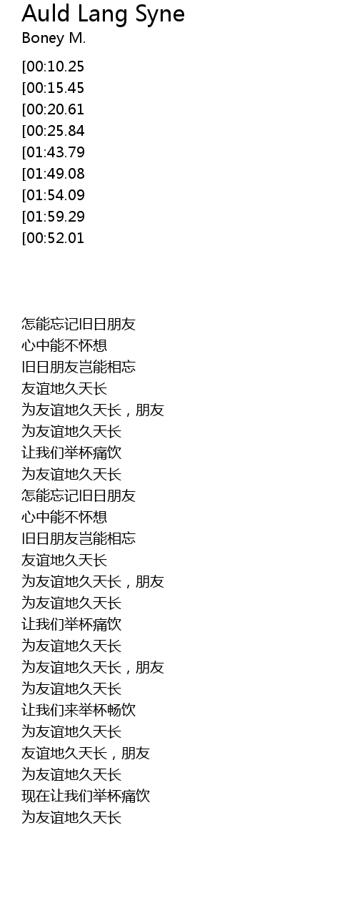 | [01:17.80][00:25.84] | And days of auld lang syne |
