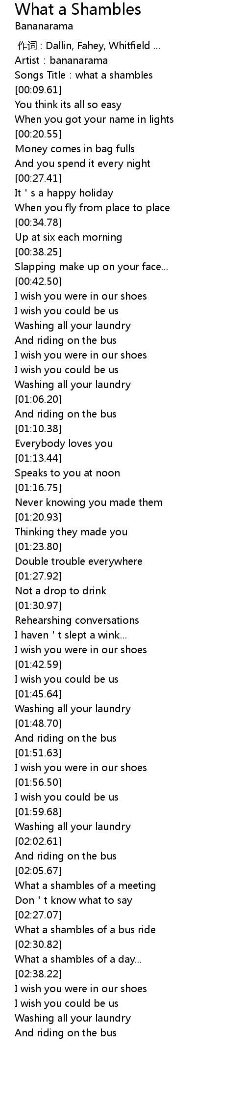 | [00:04.50] | Songs Title:what a shambles |