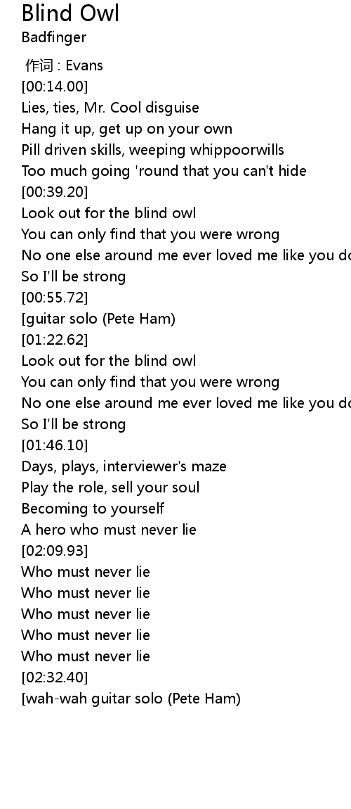 | [00:40.20] | Look out for the blind owl |