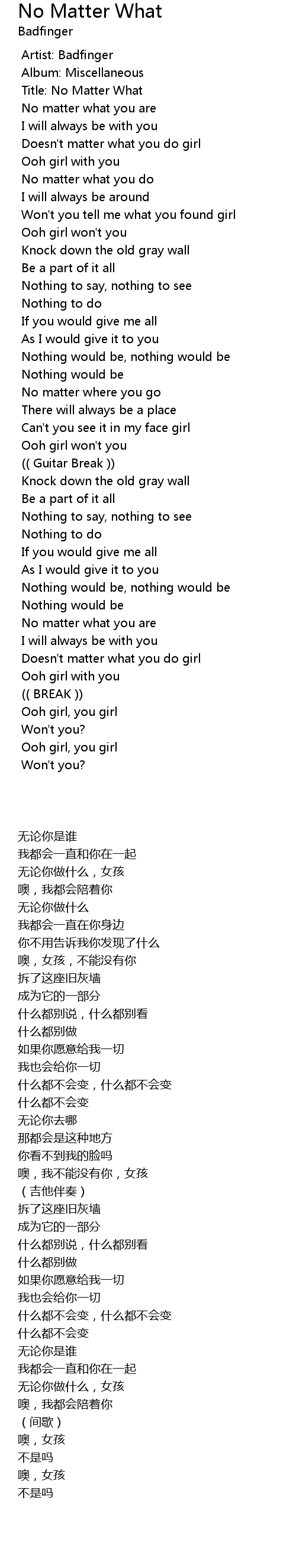 | [00:05.24] | Title: No Matter What |