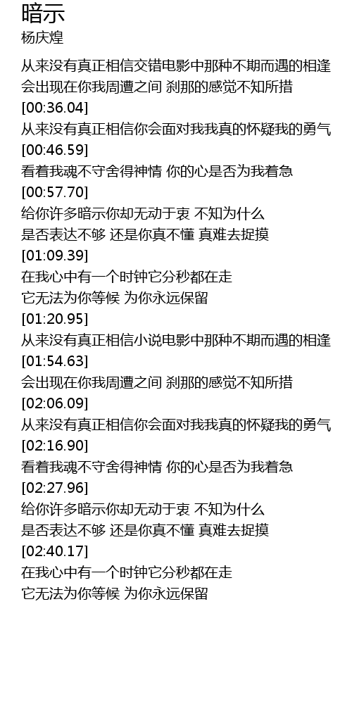 | [00:58.69] | 给你许多暗示你却无动于衷 不知为什么 |