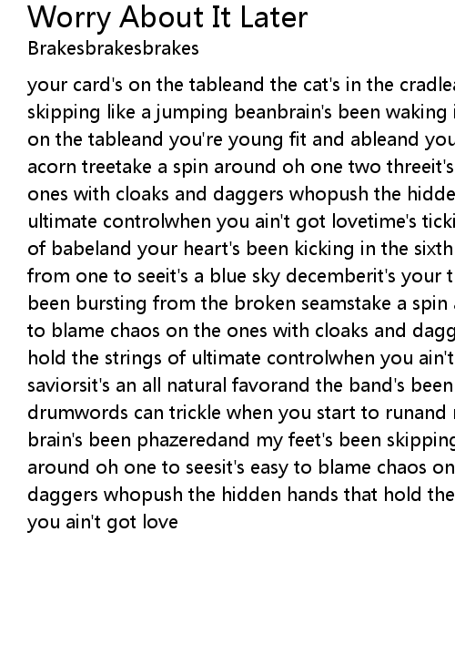 your card's on the tableand the cat's in the cradleand your heart's been skipping like a jumping beanbrain's been waking in the sixth degreesyour time's on the tableand you're young fit and ableand your love's been aching like an acorn treetake a spin around oh one two threeit's easy to blame chaos on the ones with cloaks and daggers whopush the hidden hands that hold the strings of ultimate controlwhen you ain't got lovetime's ticking tables and the new towers of babeland your heart's been kicking in the sixth degreestake a look around from one to seeit's a blue sky decemberit's your turn to rememberoh your brain's been bursting from the broken seamstake a spin around oh one two threeit's easy to blame chaos on the ones with cloaks and daggers whopush the hidden hands that hold the strings of ultimate controlwhen you ain't got loveit's the turn of the saviorsit's an all natural favorand the band's been kicking in the old kick drumwords can trickle when you start to runand my heart's been tazeredand my brain's been phazeredand my feet's been skipping like jumping beanstake a spin around oh one to seesit's easy to blame chaos on the ones with cloaks and daggers whopush the hidden hands that hold the strings of ultimate controlwhen you ain't got love |