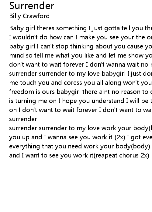Baby girl theres something I just gotta tell you there aint nothin in this world I wouldn't do how can I make you see your the only one for me I want you to know baby girl I can't stop thinking about you cause your sexy waist is playin on my mind so tell me what you like and let me show you love tonight its allright I don't want to wait forever I don't wanna wait no more waiting for you to surrender surrender to my love babygirl I just don't mind you getting closer let me touch you and coress you all along won't you come with me sex your body free freedom is ours babygirl there aint no reason to deny it cause the way you move is turning me on I hope you understand I will be the best I can so lets get it on I don't want to wait forever I don't want to wait no more waiting for you to surrender |