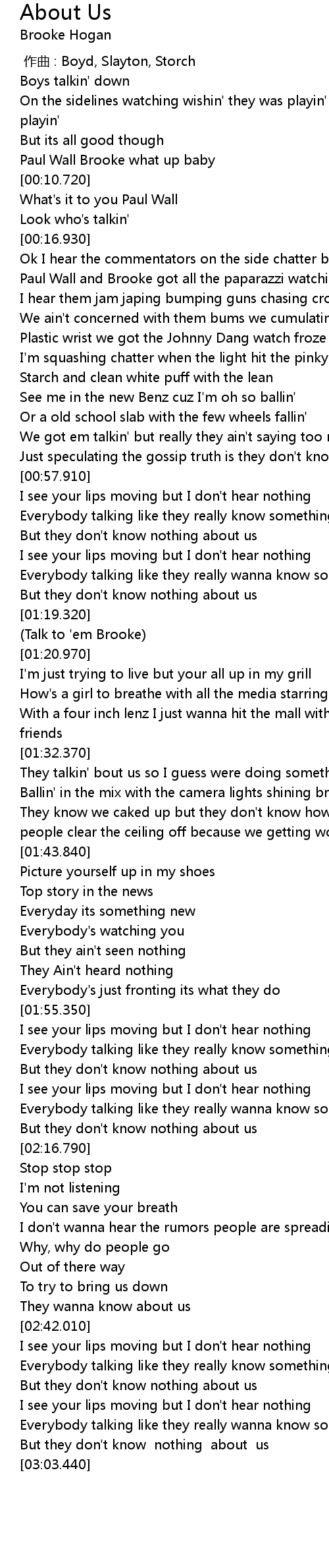 | [01:12.360] | Everybody talking like they really wanna know something about us |