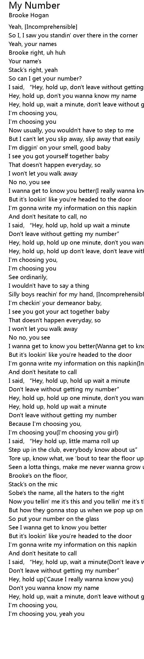 | I said, " Hey, hold up, wait a minute Don' t leave without getting my number | |