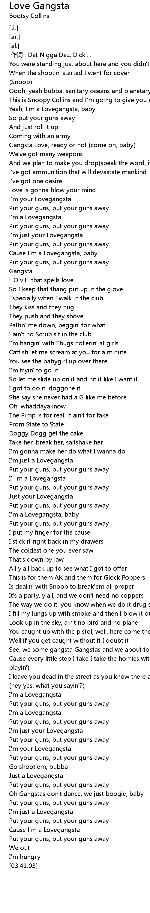 | [03:24.87] | I' m just a Lovegangsta |