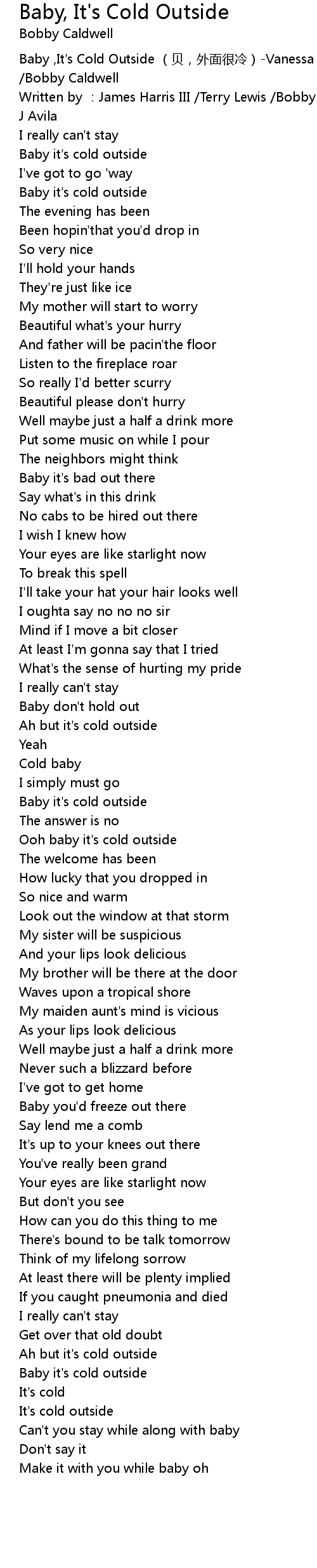 | [00:00.00] | Baby , It' s Cold Outside bèi, wài miàn hěn lěng Vanessa Williams Bobby Caldwell |