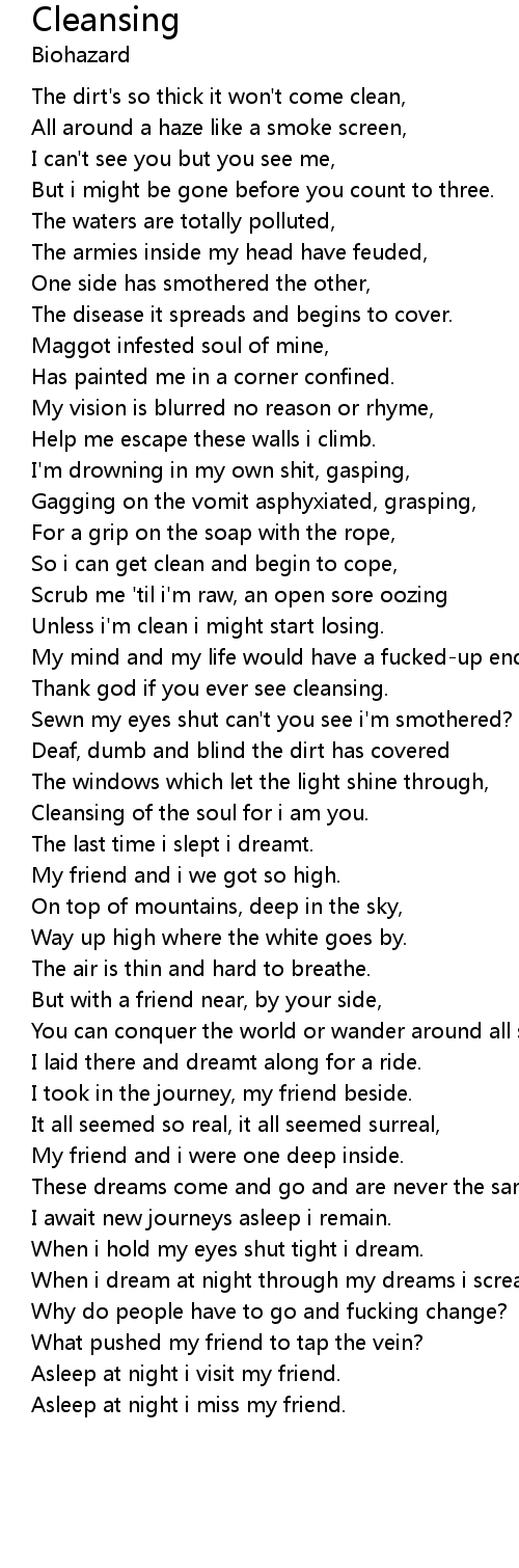 | Scrub me 'til i'm raw, an open sore oozing | |