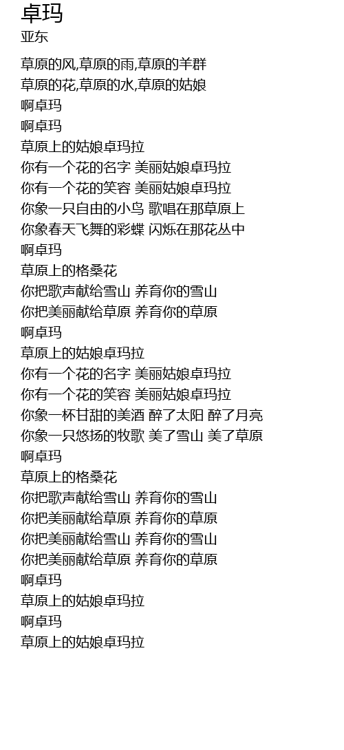 | [01:00.890] | 你有一个花的名字 美丽姑娘卓玛拉 |