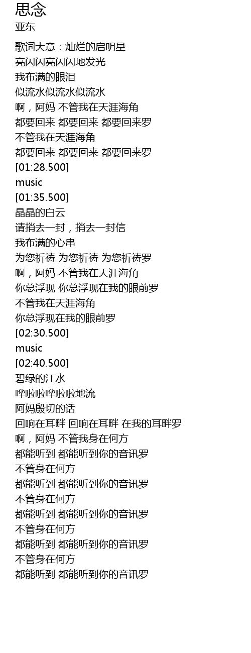 | [03:07.500] | 啊,阿妈 不管我身在何方 |