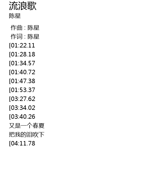 | [00:56.82][01:34.57][03:02.55] | 流浪的脚步走遍天涯 |