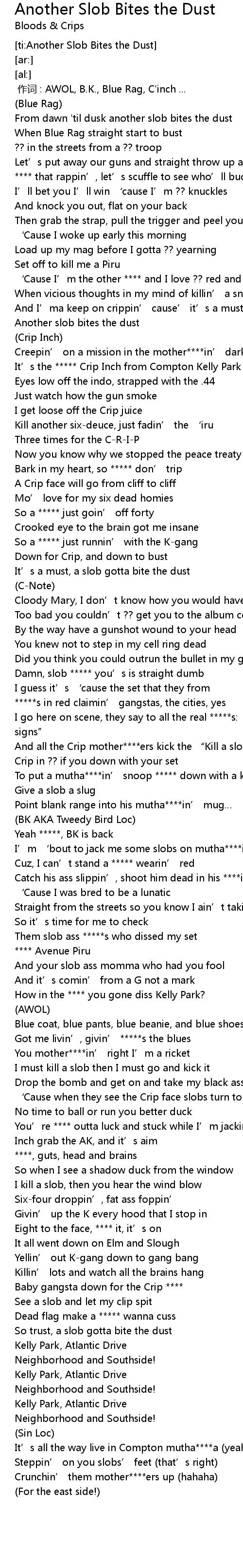 | [01:40.74] | And all the Crip mother****ers kick the “Kill a slob”-rhyme |