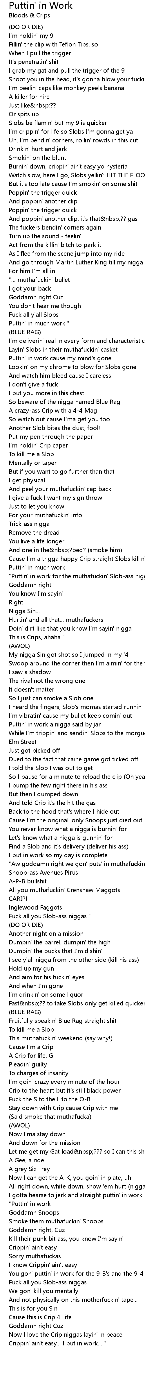 "Puttin' in work for the muthafuckin' Slob-ass niggas |