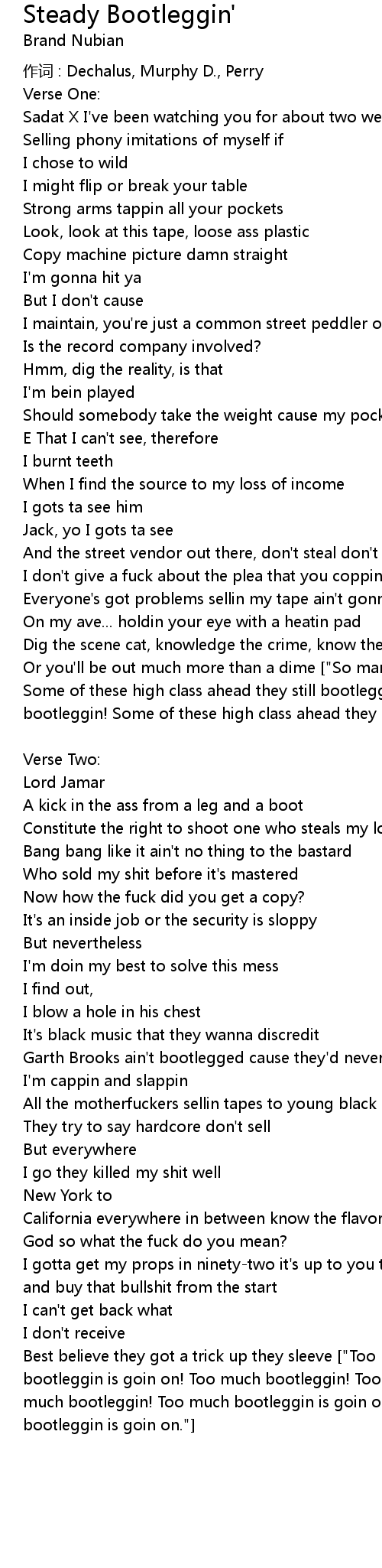 | Or you' ll be out much more than a dime " So many fingers... steady bootleggin! Some of these high class ahead they still bootleggin! So many fingers... steady bootleggin! Some of these high class ahead they still bootleggin! Steady bootleggin! Steady bootleggin! Steady bootleggin! Steady bootleggin!" | |
