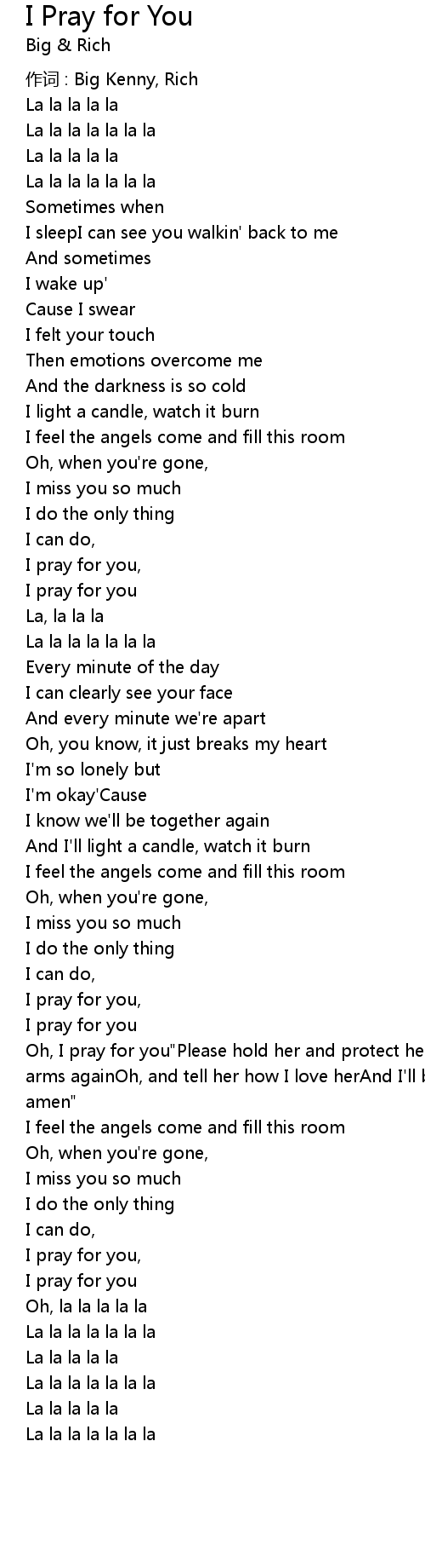 | Oh, I pray for you" Please hold her and protect her' Til she' s back here in my arms againOh, and tell her how I love herAnd I' ll be waitin' right here forever, amen" | |