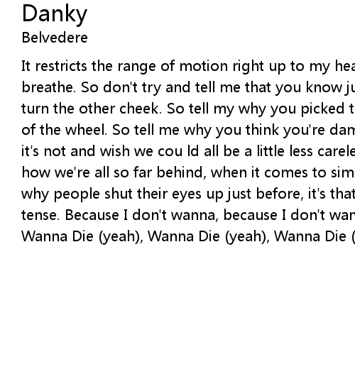 It restricts the range of motion right up to my head and it even pains me when I breathe. So don't try and tell me that you know just how I feel I don't wanna turn the other cheek. So tell my why you picked that tape up off the floor eyes of the wheel. So tell me why you think you're damned to say you're sorry but it's not and wish we cou ld all be a little less careless sometimes. I wonder how we're all so far behind, when it comes to simple common sence, and I know why people shut their eyes up just before, it's that stupid people make us tense. Because I don't wanna, because I don't wanna, because I don't wanna. Wanna Die (yeah), Wanna Die (yeah), Wanna Die (yeah). |
