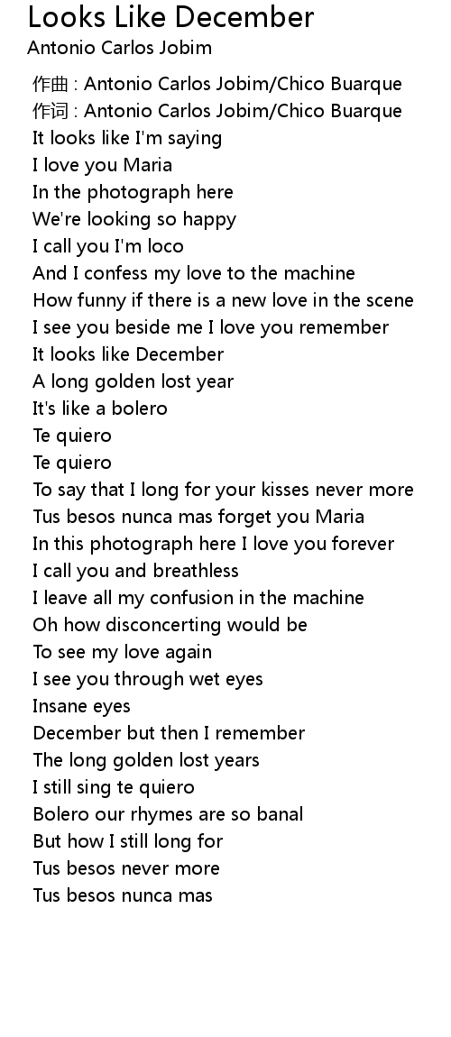 | [00:01.000] | 作词 : Antonio Carlos Jobim/Chico Buarque |