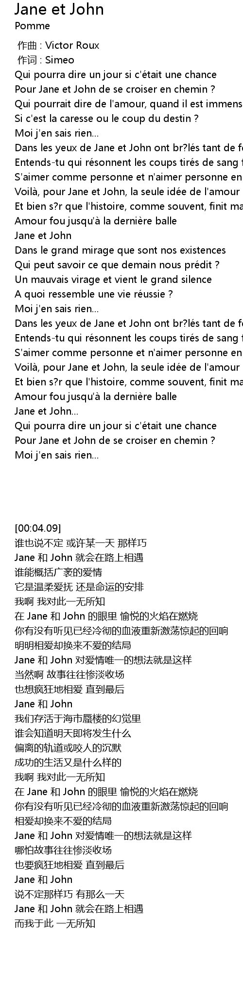 | [00:25.50] | Dans les yeux de Jane et John ont br? lé s tant de feux de joie |