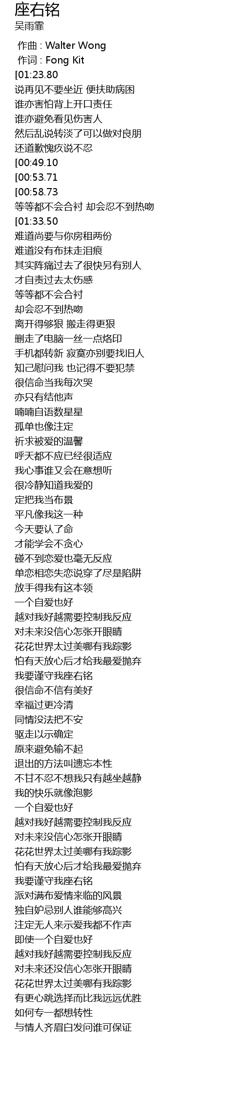 | [01:32.73] | wǒ yào jǐn shǒu wǒ zuò yòu míng |