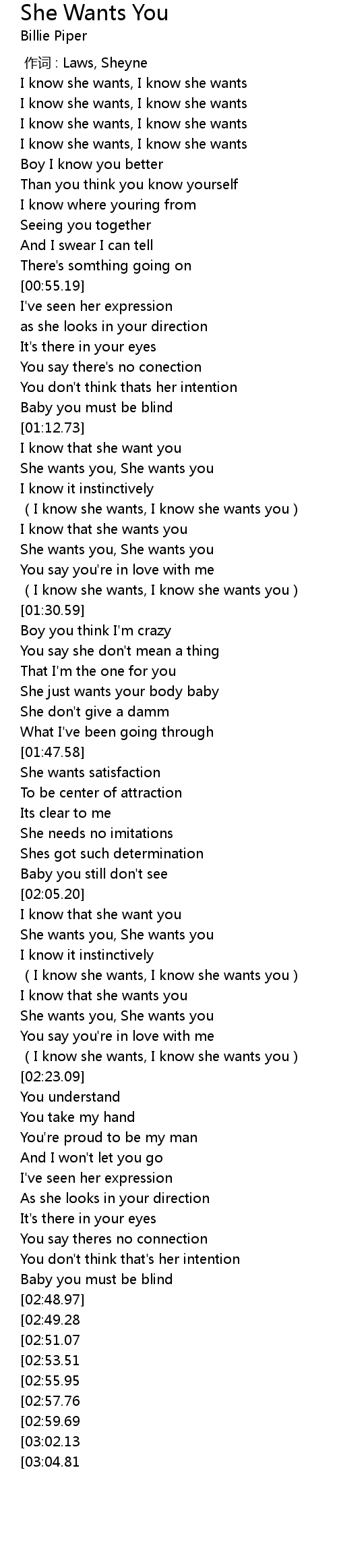 | [03:17.44][02:59.69] | She wants you, She wants you |