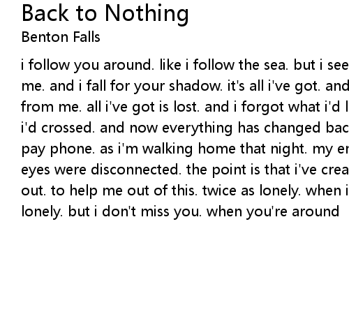 i follow you around. like i follow the sea. but i see you're not. interested in me. and i fall for your shadow. it's all i've got. and when you're walking away from me. all i've got is lost. and i forgot what i'd lost. with this line that i'd crossed. and now everything has changed back to nothing. i see you by the pay phone. as i'm walking home that night. my emotions were unaffected. and my eyes were disconnected. the point is that i've created this crush. to help me out. to help me out of this. twice as lonely. when i'm with you. twice as lonely. but i don't miss you. when you're around |
