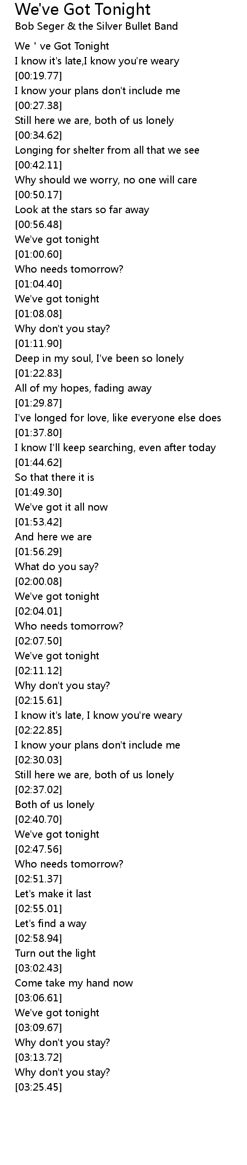 | [00:15.46] | I know it' s late, I know you' re weary |