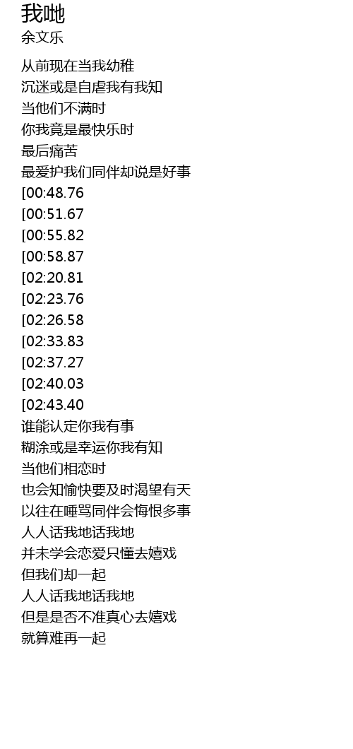 | [03:39.26][02:43.40][01:26.96] | 人人话我地我地 |