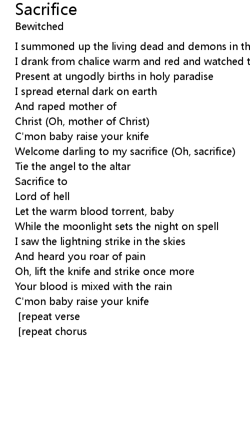 Welcome darling to my sacrifice (Oh, sacrifice) [repeat verse 1] [repeat verse 2] [repeat chorus] |