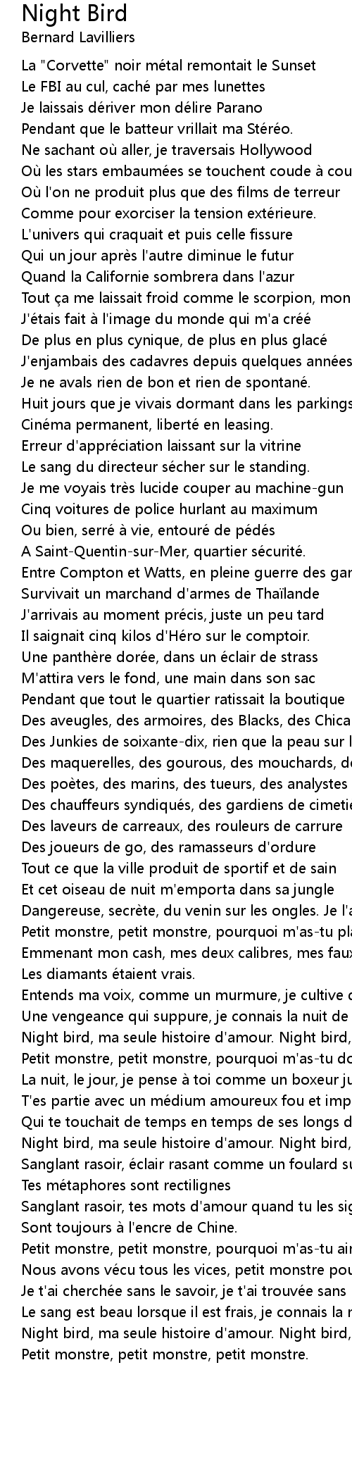 | Night bird, ma seule histoire d' amour. Night bird, on se reverra un jour. | |