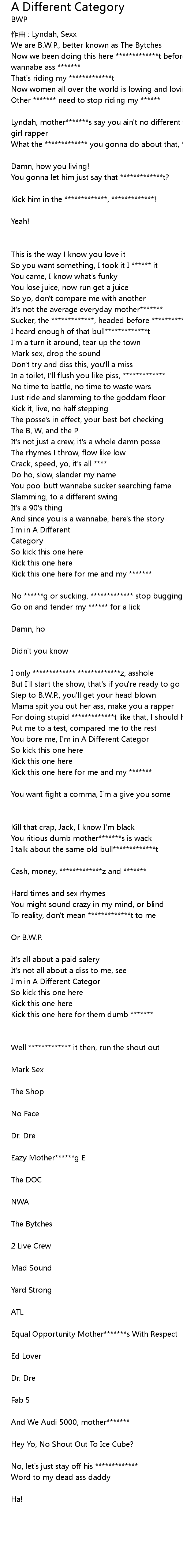 | Lyndah, mother*******s say you ain't no different from any other goddam | |
