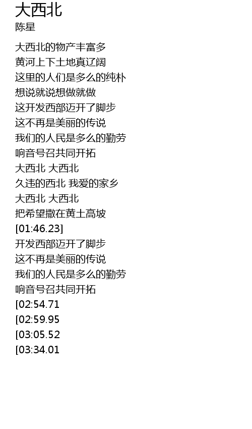 | [03:17.52][02:54.71][02:32.18] | 大西北 大西北 |